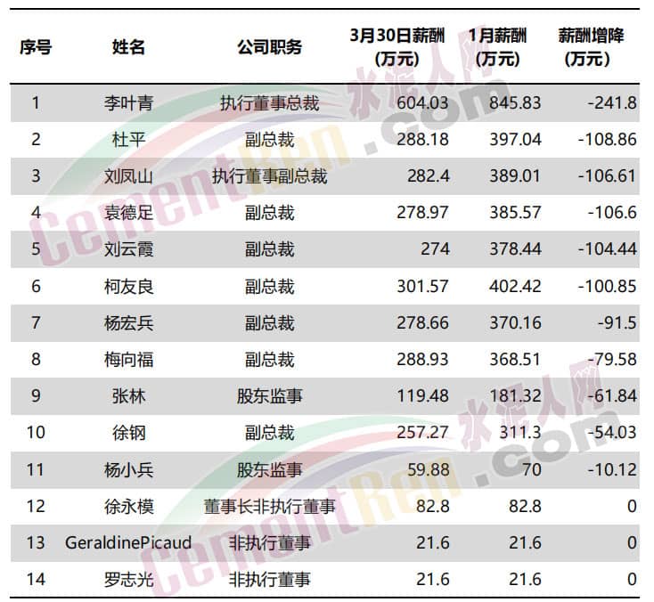 水泥人網(wǎng)注意到,最新公布的上市公司部分高管年薪較此前披露的數(shù)據(jù)有所下降。其中總裁李葉青薪酬直降241.8萬元,從845.83萬降至604.03萬元 ;杜平、劉鳳山、袁德足、劉云霞、柯友良等五位副總裁均有超過100萬元的降薪;14位高管中有11位高管薪酬出現(xiàn)不同幅度的下調(diào)。