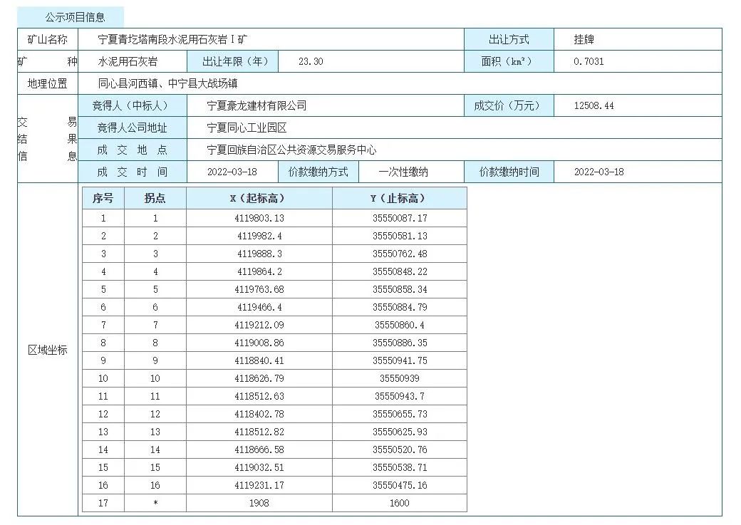 近日,自然資源部發布了關于寧夏青圪塔南段水泥用石灰巖Ⅰ礦采礦權掛牌出讓結果公示。中國水泥網從公示中得知寧夏豪龍建材以1.25億元競得了該礦山采礦權。