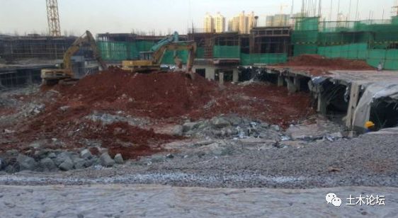 從中駿雍景灣公布的情況說明,此事故發(fā)生的時期同樣是頂板回填土期間,從現(xiàn)場的事故圖片可以了解,在土方回填階段,中駿雍景灣地庫并未進行地下頂板加固!