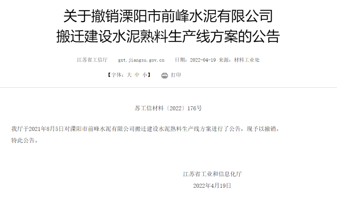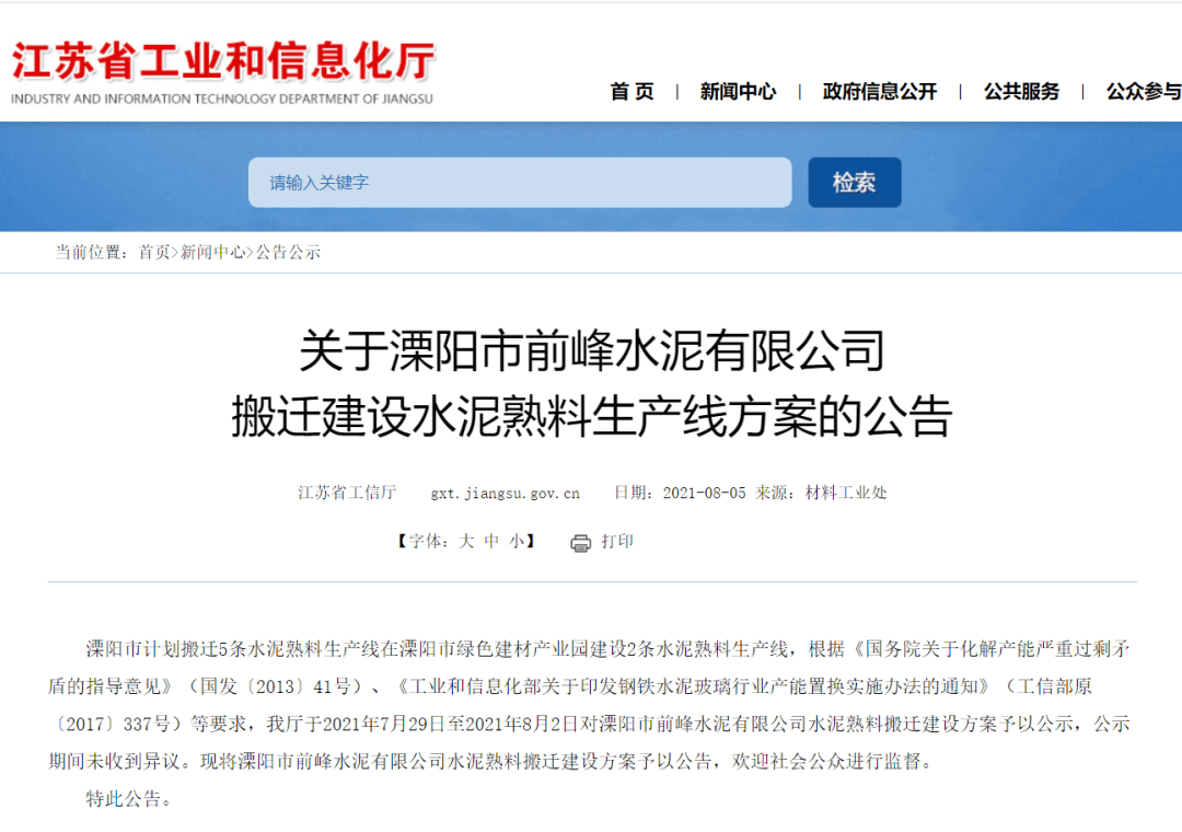 江蘇省工信廳2021年8月5日公告顯示,溧陽市計劃搬遷5條水泥熟料生產(chǎn)線在溧陽市綠色建材產(chǎn)業(yè)園建設(shè)兩條水泥熟料生產(chǎn)線。根據(jù)相關(guān)文件要求,江蘇省工信廳于2021年7月29日至2021年8月2日對溧陽市前峰水泥有限公司水泥熟料搬遷建設(shè)方案予以公示,公示期間未收到異議。并將溧陽市前峰水泥有限公司水泥熟料搬遷建設(shè)方案予以公告,歡迎社會公眾進(jìn)行監(jiān)督。