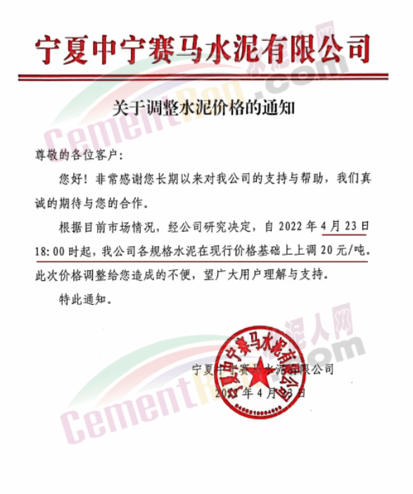 寧夏天元建材有限公司銷售部通知,自2022年4月23日8時起,公司各規(guī)格型號水泥產(chǎn)品銷售價格在原售價基礎(chǔ)上每噸上調(diào)30元。
