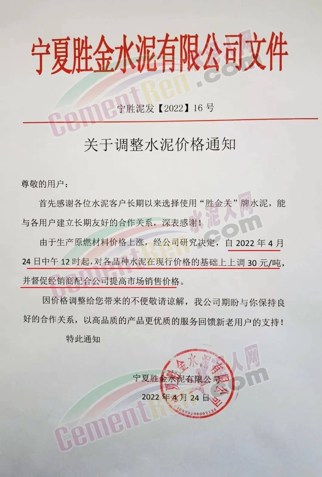 盡管絕大多數區域水泥市場行情低迷,但是,為了緩解成本上漲壓力,多區域主要品牌企業仍持續推漲水泥價格。日前寧夏回族自治區賽馬水泥、瀛海天祥、天元建材等多家品牌企業通知上調水泥價格20-30元/噸。寧夏勝金水泥有限公司通知,由于生產原燃材料價格上漲,自4月24日中午12時起對各品種水泥在現行價格基礎上上調30元/噸,并督促經銷商配合公司提高市場銷售價格。