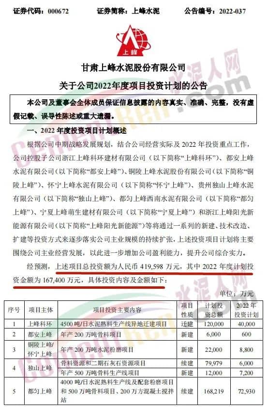 4月27日,甘肅上峰水泥股份有限公司發(fā)布《關(guān)于公司2022年度項(xiàng)目投資計(jì)劃的公告》稱,2022年,其控股子公司浙江上峰科環(huán)建材有限公司、都安上峰水泥有限公司、銅陵上峰水泥股份有限公司、懷寧上峰水泥有限公司、貴州獨(dú)山上峰水泥有限公司、都勻上峰西南水泥有限公司、寧夏上峰萌生建材有限公司和浙江上峰陽(yáng)光新能源有限公司等將通過(guò)一系列的新建、技術(shù)改造、擴(kuò)建等投資方式來(lái)逐步落實(shí)公司主業(yè)規(guī)模的持續(xù)擴(kuò)張。