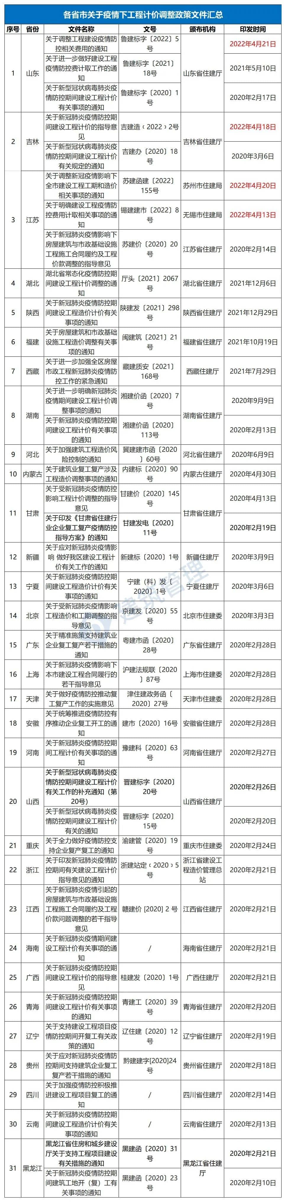 截至目前,各省市在疫情防控期間建設(shè)工程計(jì)價(jià)政策文件如下: