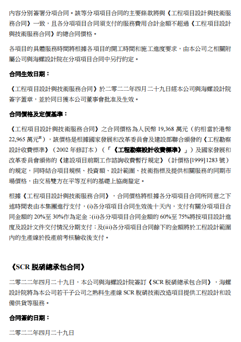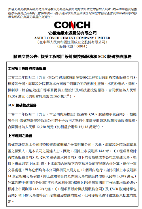 SCR脫硝技改服務,2022年4月29日,本公司與海螺設計院簽署《SCR脫硝總承包合同》,根據該合同,海螺設計院將為本公司若干子公司之熟料生產線提供SCR脫硝技術改造服務,注合同價格為人民幣12,750萬元(約相當于港幣15,118萬元)。