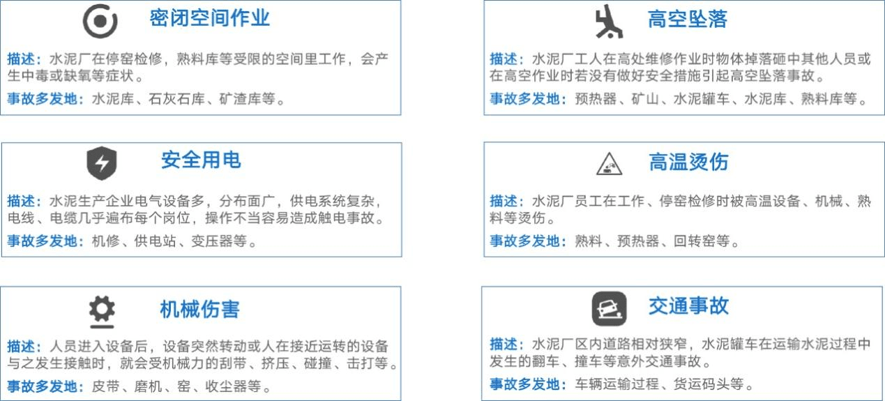 隨著水泥行業(yè)的快速發(fā)展和先進(jìn)工藝的廣泛使用,重大危險(xiǎn)源、事故隱患、職業(yè)危害等涉及安全生產(chǎn)的問題也隨之增多,生產(chǎn)安全事故時(shí)有發(fā)生。目前企業(yè)生產(chǎn)經(jīng)營中存在的事故及隱患大致分為以下幾類: