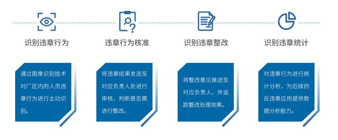 基于對(duì)人員各類違章行為的主動(dòng)識(shí)別,可實(shí)現(xiàn)違章行為記錄、核準(zhǔn)、整改,從而實(shí)現(xiàn)違章業(yè)務(wù)的全流程管理,提高安監(jiān)管理效率。