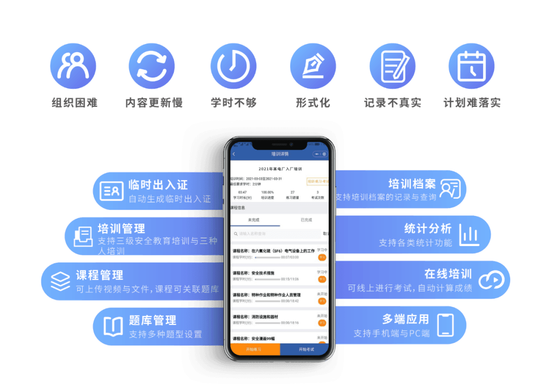 針對(duì)水泥企業(yè)對(duì)于內(nèi)部人員與外委單位人員的培訓(xùn)需求,系統(tǒng)提供了考試培訓(xùn)應(yīng)用模塊。可根據(jù)不同的人員身份提供人臉認(rèn)證實(shí)名培訓(xùn)和考核,并將信息錄入、上傳、留痕,實(shí)現(xiàn)無紙化考試。