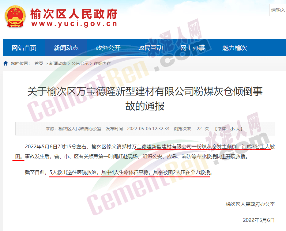 山西晉中榆次區(qū)人民政府消息:2022年5月6日7時15分左右,榆次區(qū)修文鎮(zhèn)郭村萬寶德隆新型建材有限公司一粉煤灰倉發(fā)生傾倒,造成7名工人被困。