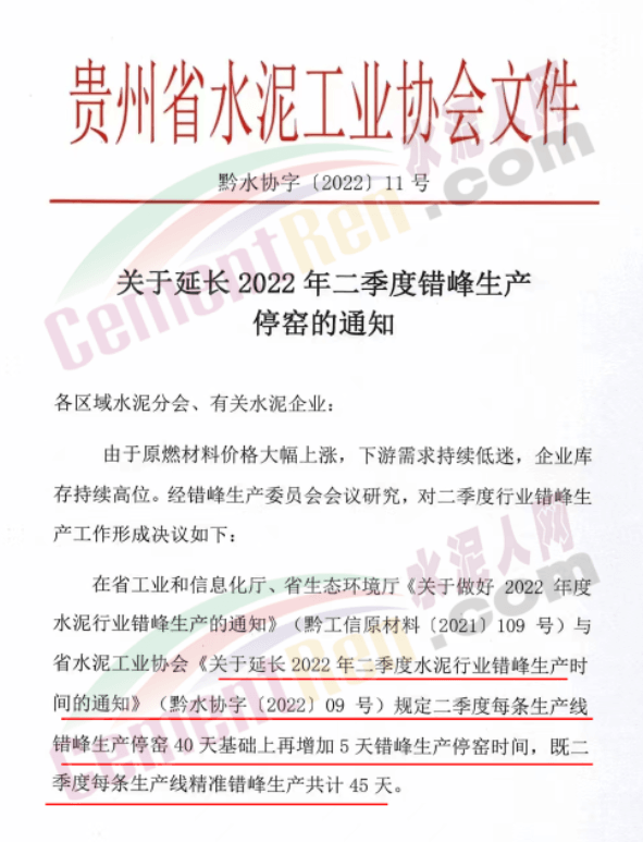 在貴州省工業和信息化廳、省生態環境廳《關于做好2022年度水泥行業錯峰生產的通知》與省水泥工業協會《關于延長2022年二季度水泥行業錯峰生產時間的通知》規定二季度每條生產線錯峰生產停窯40天基礎上再增加5天錯峰生產停窯時間,既二季度每條生產線精準錯峰生產共計45天。有關要求如下∶
