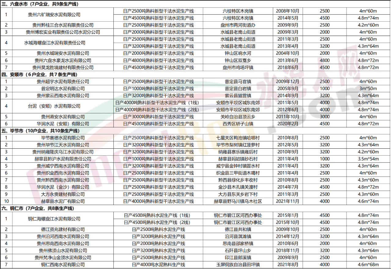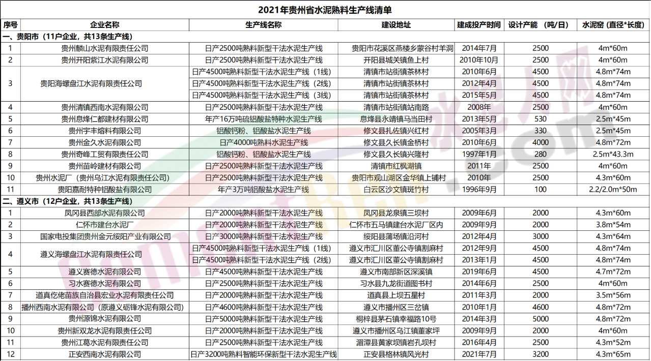 從貴州省工信廳發布的《2021年度水泥熟料生產線清單》可見貴州省內共有水泥熟料生產線94條,合計產能8449.2萬噸。
