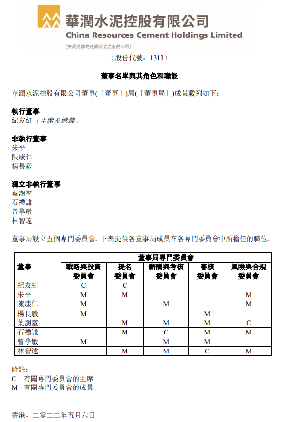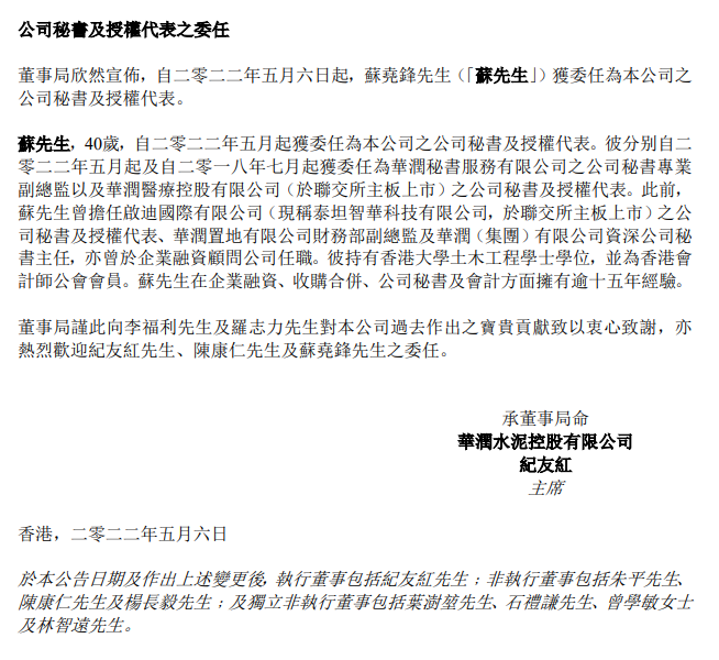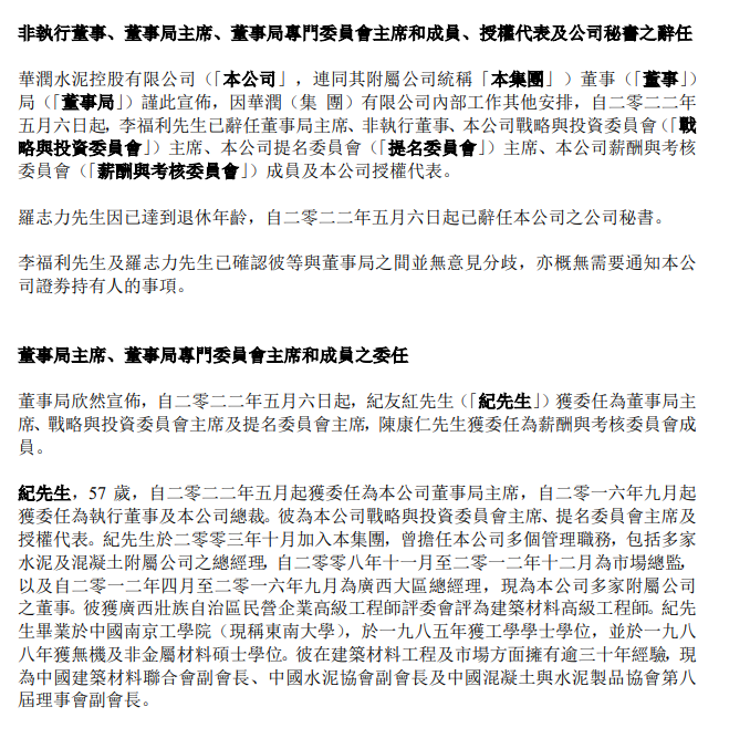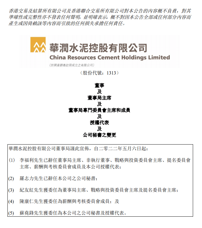 華潤水泥控股5月6日午間在港交所公告,董事局宣布,自2022年5月6日起:李福利已辭任董事局主席、非執(zhí)行董事、戰(zhàn)略與投資委員會主席、提名委員會主席、薪酬與考核委員會成員及本公司授權(quán)代表;羅志力已辭任本公司之公司秘書;