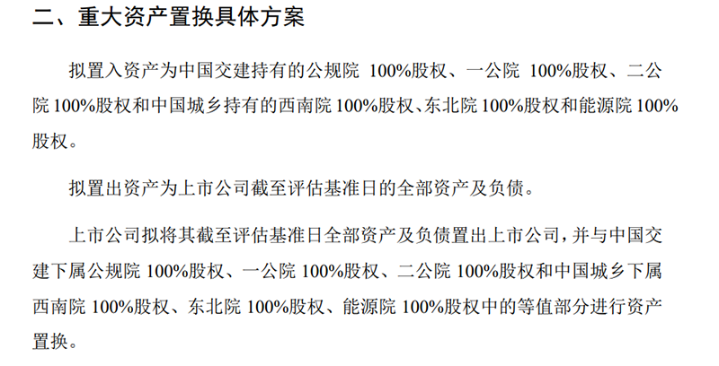 首先,公司擬將其截至評估基準(zhǔn)日全部資產(chǎn)及負(fù)債置出上市公司,并與中國交建下屬公規(guī)院100%股權(quán)、一公院 100%股權(quán)、二公院100%股權(quán)和中國城鄉(xiāng)下屬西南院 100%股權(quán)、東北院100%股權(quán)、能源院100%股權(quán)中的等值部分進(jìn)行資產(chǎn)置換。