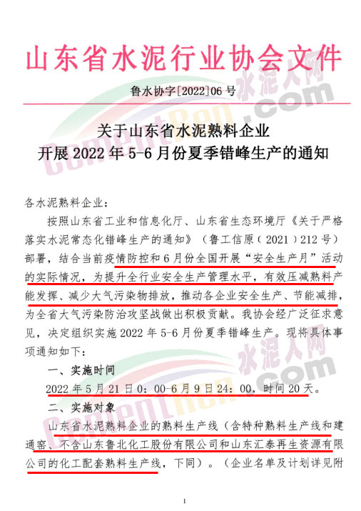 實施時間為2022年5月21日0:00-6月9日24:00,時間20天。實施對象為山東省水泥熟料企業的熟料生產線(含特種熟料生產線和建通窯、不含山東魯北化工股份有限公司和山東匯泰再生資源有限公司的化工配套熟料生產線)。