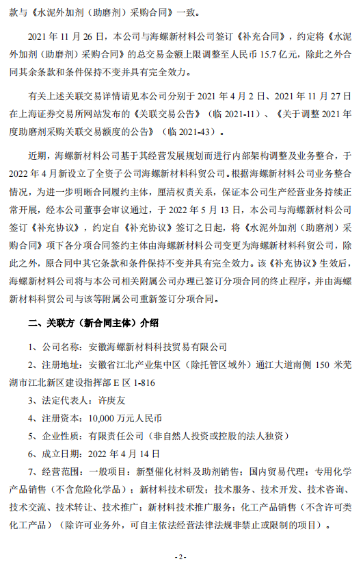 日前,海螺水泥發布《關于關聯交易合同主體變更的公告》稱,2022年5月13日,安徽海螺水泥股份有限公司與安徽海螺新材料科技有限公司簽訂《關于<水泥外加劑(助磨劑)采購合同>的補充協議》,約定自《補充協議》簽訂之日起,將《水泥外加劑(助磨劑)采購合同》項下各分項合同簽約主體由海螺新材料公司變更為其全資子公司安徽海螺新材料科技貿易有限公司,除此之外,原合同中其它條款和條件保持不變并具有完全效力。