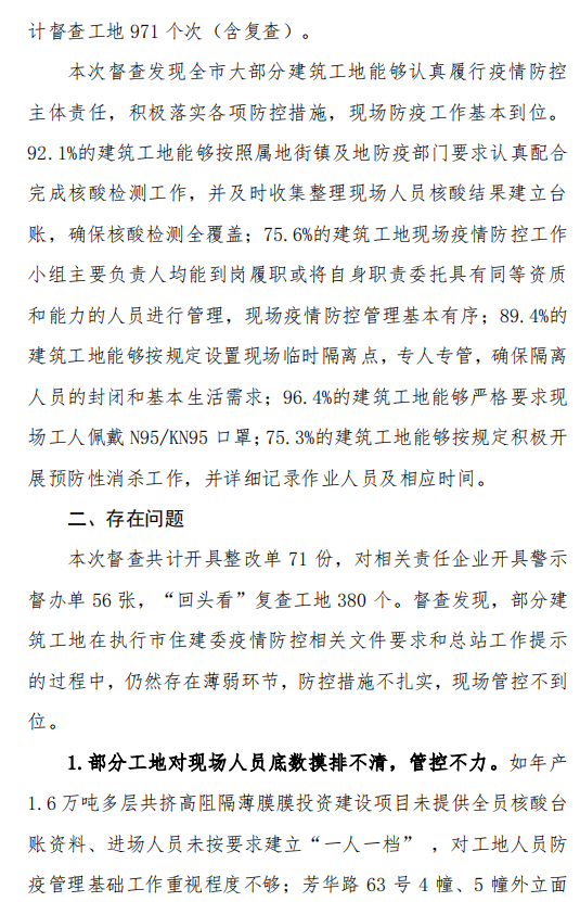本次督查共計(jì)開(kāi)具整改單71份,對(duì)相關(guān)責(zé)任企業(yè)開(kāi)具警示督辦單56張,“回頭看”復(fù)查工地380個(gè)。督查發(fā)現(xiàn),部分建筑工地在執(zhí)行市住建委疫情防控相關(guān)文件要求和總站工作提示的過(guò)程中,仍然存在薄弱環(huán)節(jié),防控措施不扎實(shí),現(xiàn)場(chǎng)管控不到位。