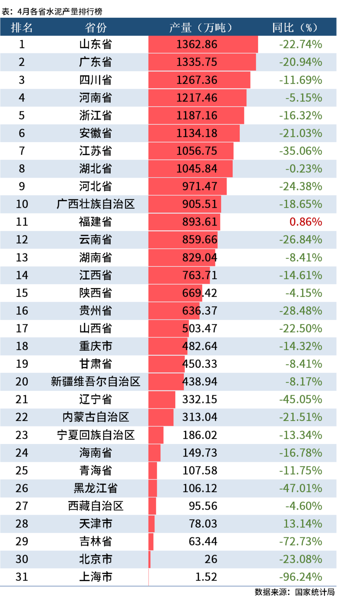 從分省數(shù)據(jù)來看,30省數(shù)市產(chǎn)量均有不同程度的下降,僅有福建省小幅增長0.86%。其中,4月全國14個(gè)省市水泥產(chǎn)量同比降幅超20%,上海降96.24%、吉林降72.73%,黑龍江降47.01%、遼寧降45.05%、江蘇降35.06%、貴州降28.48%,云南降26.84%、河北降24.38%、北京降23.08%、內(nèi)蒙古降21.51%、山東降22.74%、安徽降低21.03%和廣東降20.94%。具體情況如下: