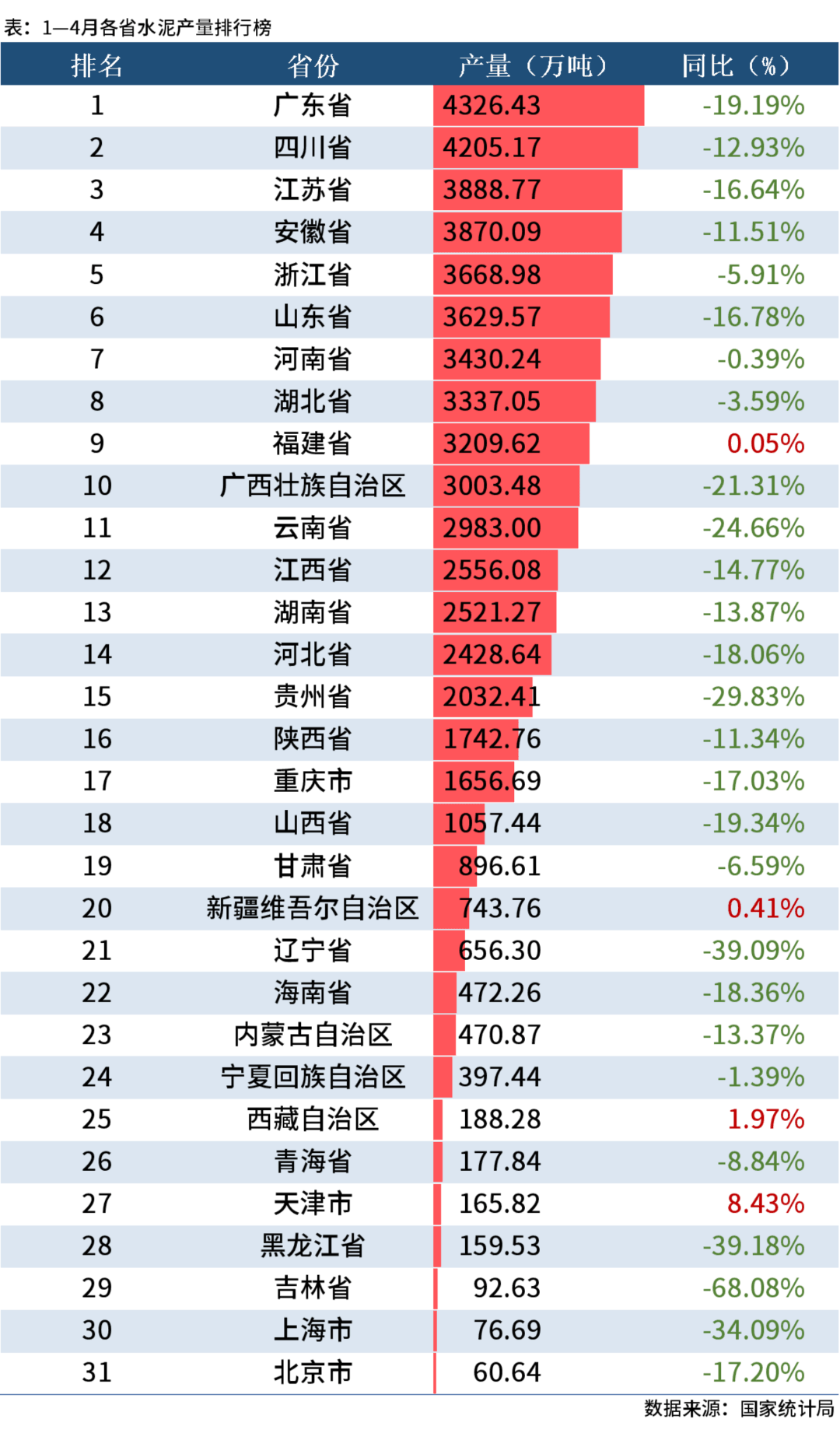 據(jù)國家統(tǒng)計(jì)局公布的數(shù)據(jù)顯示,中國4月水泥產(chǎn)量為19471萬噸,同比減少18.9%。1-4月累計(jì)水泥產(chǎn)量為58106萬噸,同比下降14.8%。