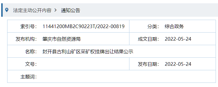 據悉,去年11月,該礦權由于涉及礦業權糾紛,不能及時解決,掛牌交易終止。今年4月11日,在肇慶市自然資源局網上進行二次掛牌交易。