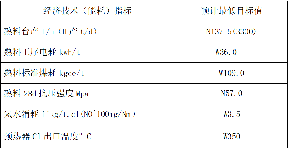 項目二:現公司擬利用2022年雨季集中期(7-10月份左右)對熟料燒成系統進行節能降耗改造,以及染污物排放深度治理改造。公司期望通過本次技術改造后,各項經濟技術(能耗)指標達到(不得低于)下表要求: