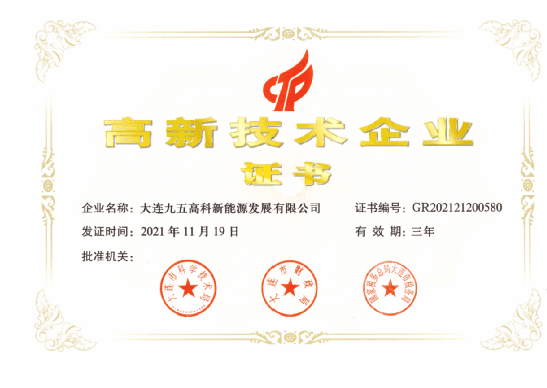 大連九五高科新能源發展有限公司多項余熱發電相關專利技術,且榮獲了高新技術企業證書。