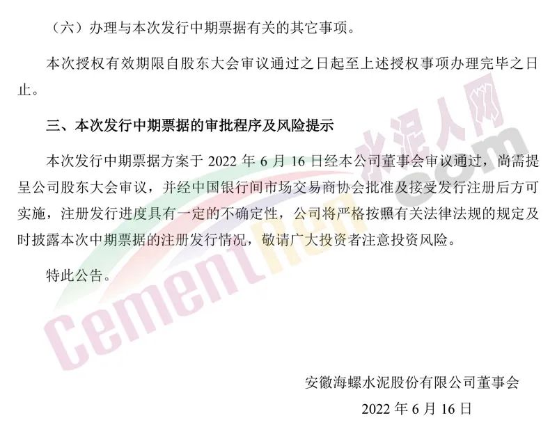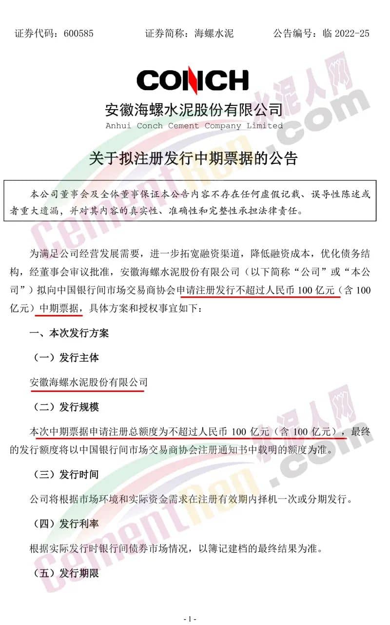 6月16日晚間,海螺水泥發(fā)布《關于擬注冊發(fā)行中期票據(jù)的公告》稱,為滿足公司經(jīng)營發(fā)展需要,進一步拓寬融資渠道,降低融資成本,優(yōu)化債務結(jié)構(gòu),經(jīng)董事會審議批準,安徽海螺水泥股份有限公司(以下簡稱“公司”或“本公司”)擬向中國銀行間市場交易商協(xié)會申請注冊發(fā)行不超過人民幣100億元(含100億元)中期票據(jù)。