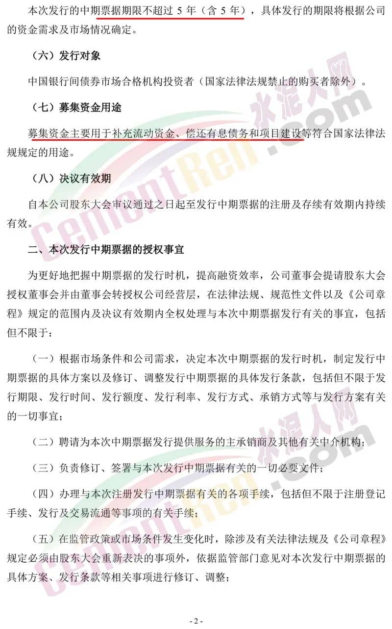 發(fā)行對象為,中國銀行間債券市場合格機構(gòu)投資者(國家法律法規(guī)禁止的購買者除外)。募集資金主要用于補充流動資金、償還有息債務和項目建設等符合國家法律法規(guī)規(guī)定的用途。自本公司股東大會審議通過之日起至發(fā)行中期票據(jù)的注冊及存續(xù)有效期內(nèi)持續(xù)有效。