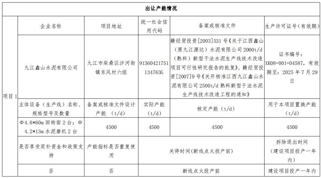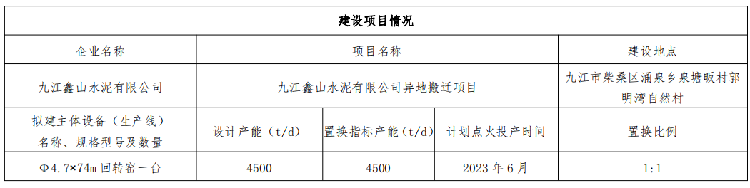 據水泥人網了解,早在2020年11月江西工信廳發布九江鑫山水泥有限公司公司 4500t/d水泥熟料生產線產能置換的公示提到,九江鑫山水泥有限公司由于處于九江高鐵新區核心區域內,不符合城市發展規劃要求,需進行異地搬遷。該企業將異地搬遷一條4500t/d水泥熟料生產線至九江市柴桑區涌泉鄉泉塘畈村郭明灣自然村,其中置換比例為1:1。