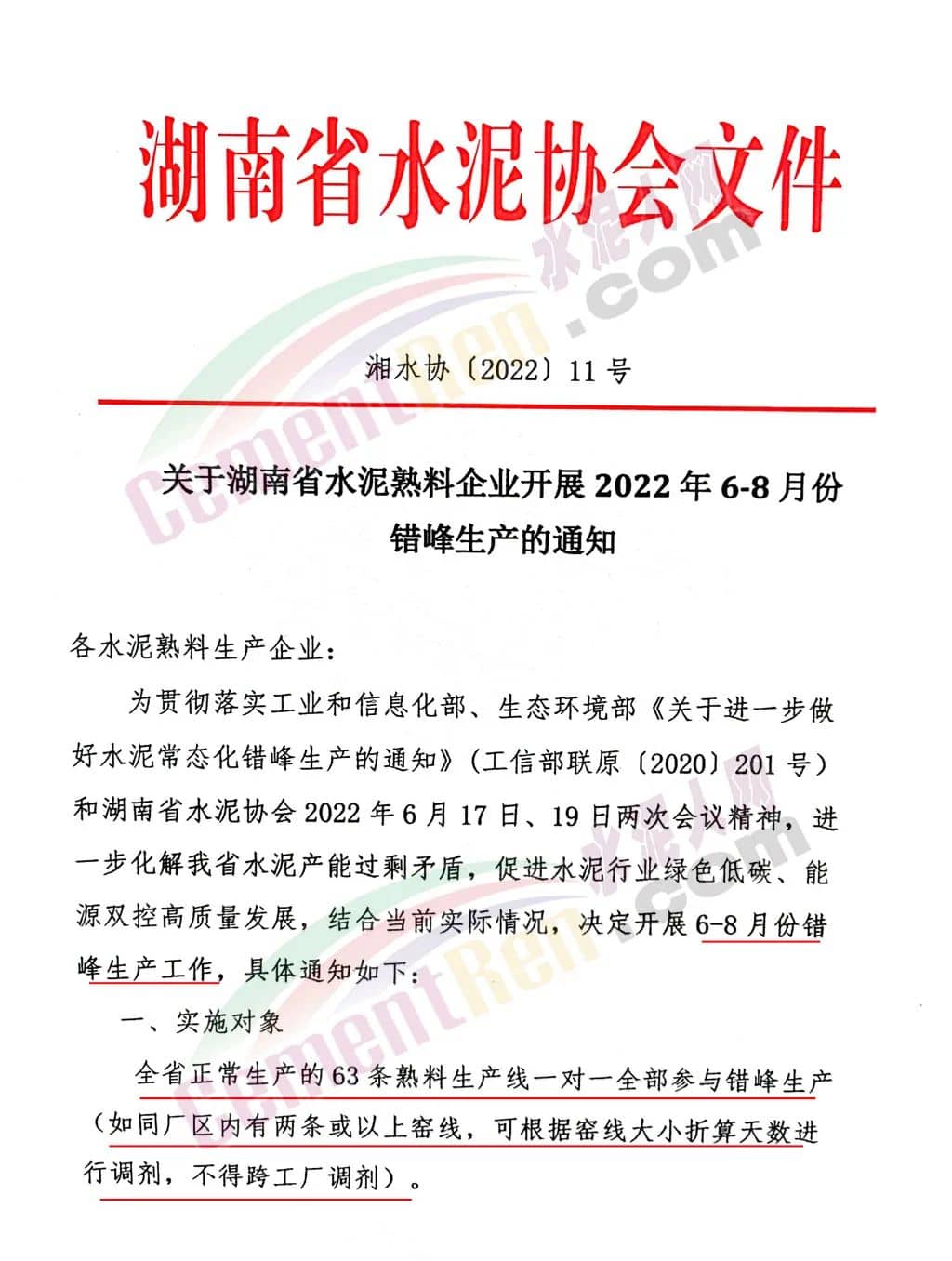 日前,湖南、江西兩省分別通知轄區(qū)內(nèi)所有水泥熟料企業(yè)執(zhí)行夏季錯(cuò)峰生產(chǎn)。湖南省通知稱,為進(jìn)一步化解水泥產(chǎn)能過剩矛盾,促進(jìn)水泥行業(yè)綠色低碳,能源雙控高質(zhì)量發(fā)展,結(jié)合當(dāng)前實(shí)際情況,決定開展6-8月份錯(cuò)峰生產(chǎn)工作。全省正常生產(chǎn)的63條熟料生產(chǎn)線一對一全部參與錯(cuò)峰生產(chǎn),如同廠區(qū)內(nèi)有兩條或以上窯線,可根據(jù)窯線大小折算天數(shù)進(jìn)行調(diào)劑,不得跨工廠調(diào)劑。