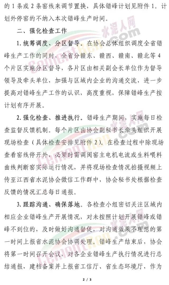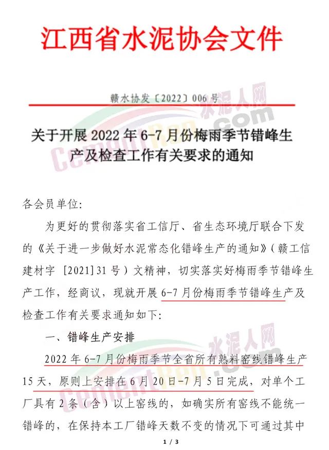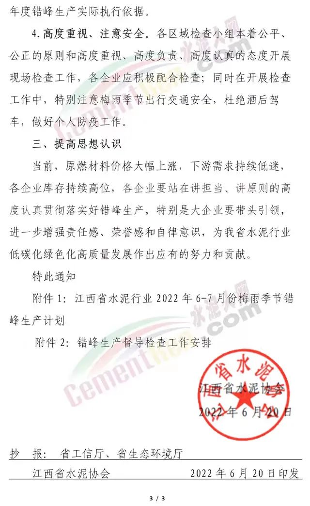江西省通知要求全省所有熟料窯線錯(cuò)峰生產(chǎn)15天,原則上安排在6月20日-7月5日完成,對單個(gè)工廠具有2條(含)以上窯線的,如確實(shí)所有窯線不能統(tǒng)一錯(cuò)的,在保持本工廠錯(cuò)峰天數(shù)不變的情況下可通過其中的1條或2條窯線來調(diào)節(jié)置換,計(jì)劃外停窯的不納入本次錯(cuò)峰生產(chǎn)時(shí)間。