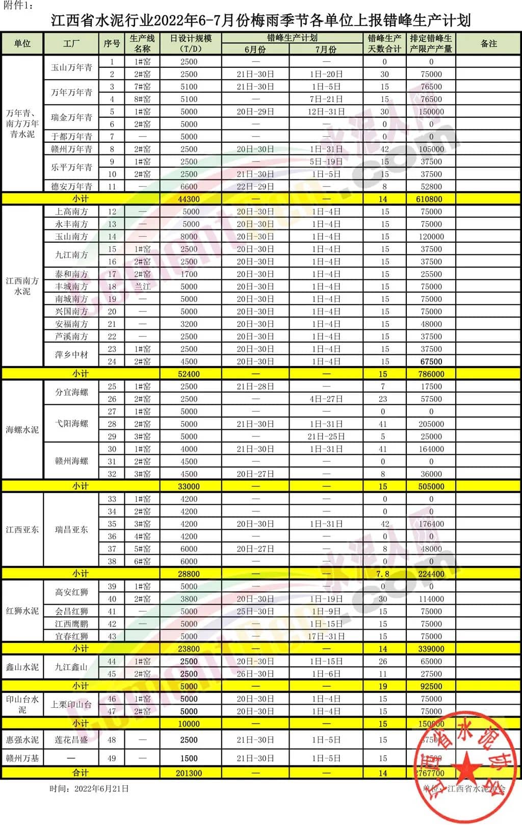 實(shí)施時(shí)間,6月20日~30日錯(cuò)峰停窯8天;7月1日~31日錯(cuò)峰停窯15天;8月1日至31錯(cuò)峰停窯20天,共停窯43天。其中6月20日到7月31日,共停23天。
