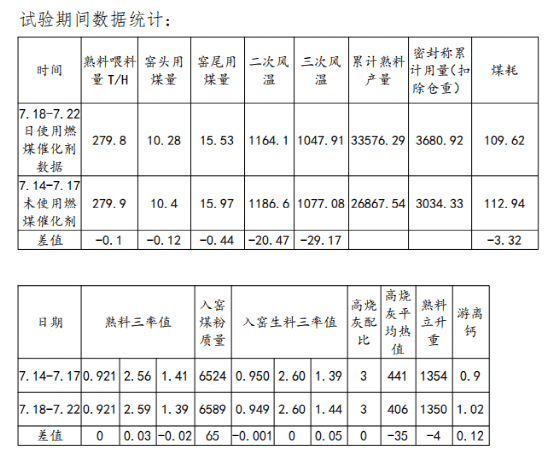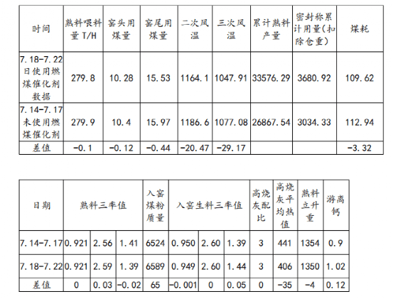 根據(jù)7月14-17日空白數(shù)據(jù)與7月18-22日使用燃煤催化劑的試驗(yàn)數(shù)據(jù)分析,使用燃煤催化劑后在煤粉倉重相同情況下煤耗降低3.32kg/t。