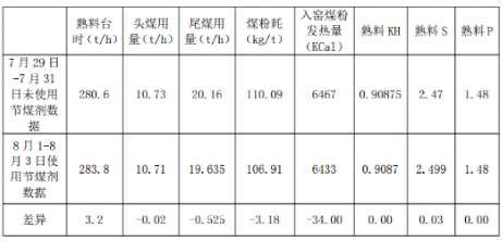 2021年8月7日合聚某公司試驗(yàn)使用朝旭燃煤催化劑,得出的數(shù)據(jù)也非常可觀,煤耗降低高達(dá)5.2kg/t: