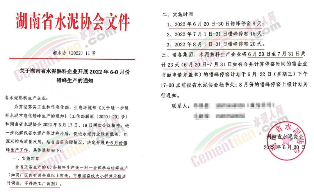 湖南省水泥協會日前通知,水泥熟料企業于2022年6-8月開展錯峰生產,全省正常生產的63條熟料生產線全部參與錯峰生產,同廠區內有兩條或以上窯線的,可根據窯線大小折算天數進行調劑,不得跨工廠調劑。停窯時間合計43天。其中,7月份停窯15天,8月份停窯20天。