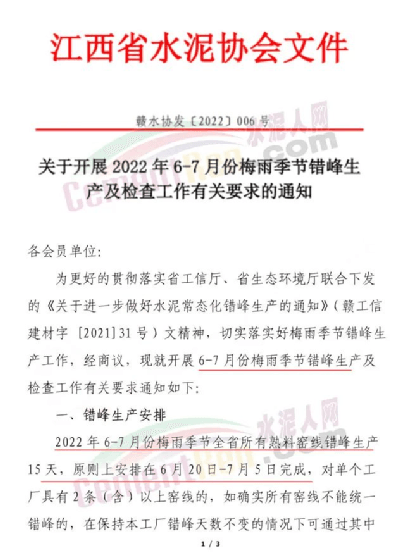 江西省水泥協會也在近日發布關于開展2022年6-7月梅雨季節錯峰生產及檢查工作有關要求的通知,全省所有熟料窯線錯峰生產15天,對單一工廠具有2條(含)以上窯線的,如確實所有窯線不能統一錯峰,在保持本工廠錯峰天數不變的情況下可通過其中的1條或2條窯線進行調節置換。計劃外停窯的不納入本次錯峰生產時間。