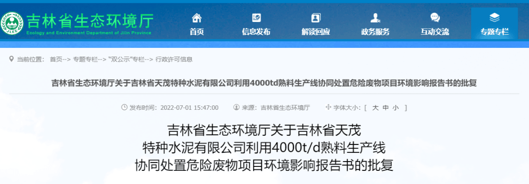你公司《關于〈吉林省天茂特種水泥有限公司利用4000t/d熟料生產(chǎn)線協(xié)同處置危險廢物項目環(huán)境影響報告書〉審查的申請》及委托吉林省中實環(huán)保工程開發(fā)有限公司編制的環(huán)境影響報告書(報批版)收悉。經(jīng)研究,現(xiàn)批復如下: