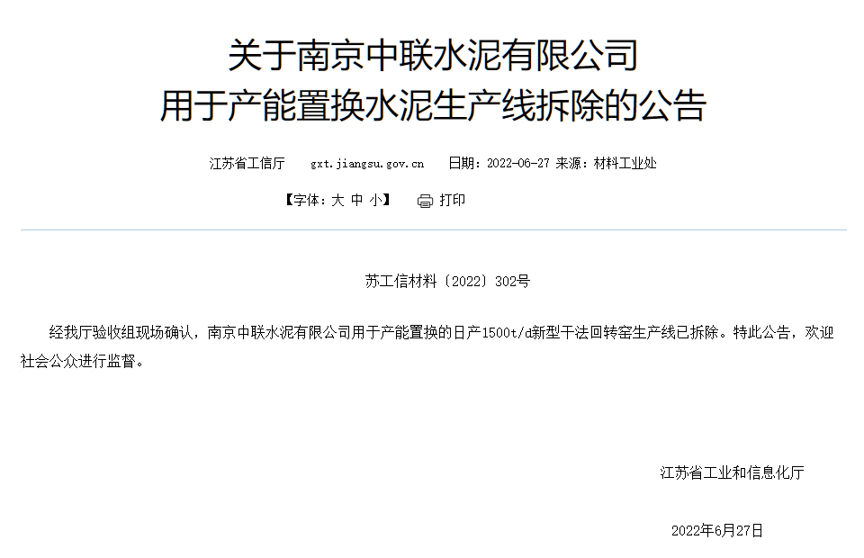 同期,江蘇省工業(yè)和信息化廳發(fā)布公告顯示,南京中聯(lián)水泥有限公司用于產(chǎn)能置換的1500t/d新型干法回轉(zhuǎn)窯生產(chǎn)線已拆除。
