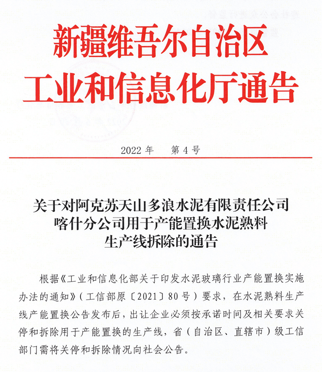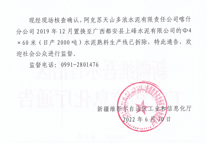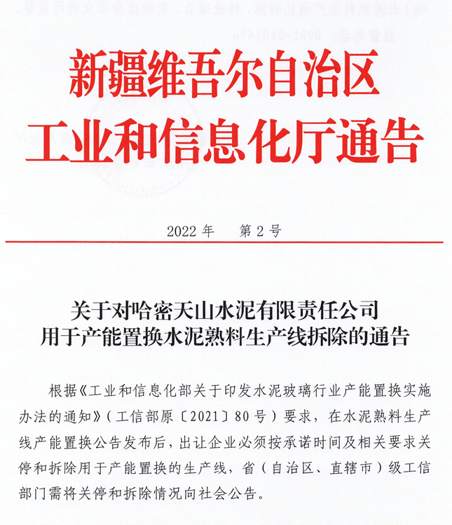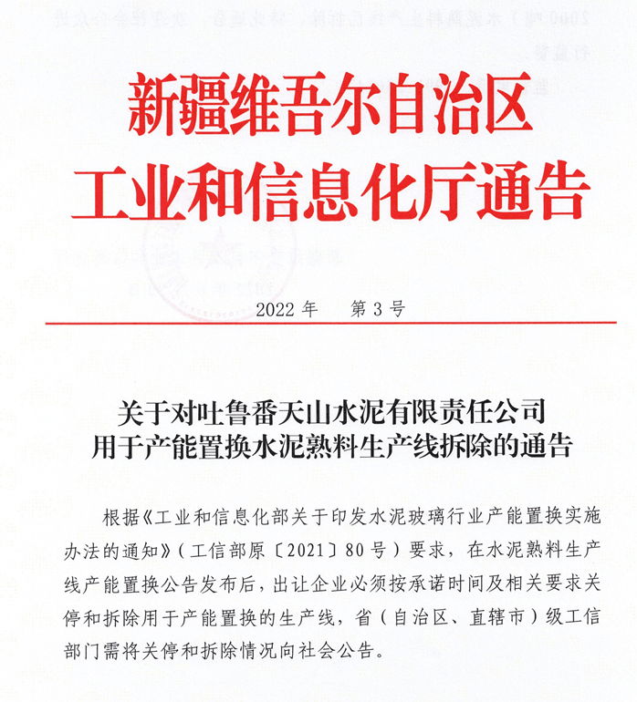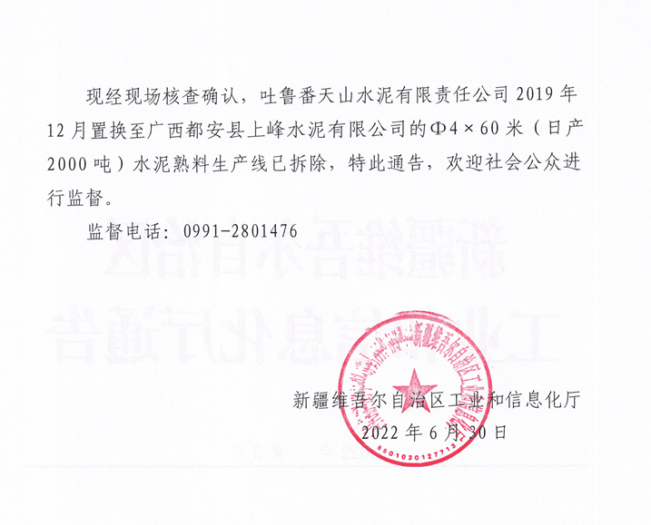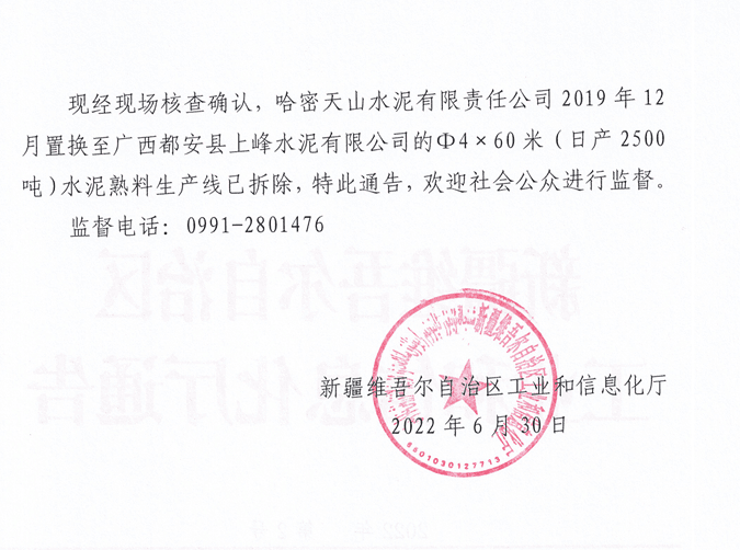 6月30日,新疆維吾爾自治區(qū)工業(yè)和信息化廳發(fā)布3則水泥生產(chǎn)線拆除的通告提到,哈密天山水泥2500t/d、吐魯番天山2000t/d、阿克蘇天山多浪水泥2000t/d熟料生產(chǎn)線已拆除。三條生產(chǎn)線產(chǎn)指指標(biāo)均置換至廣西都安縣上峰水泥有限公司的水泥熟料生產(chǎn)線項(xiàng)目。
