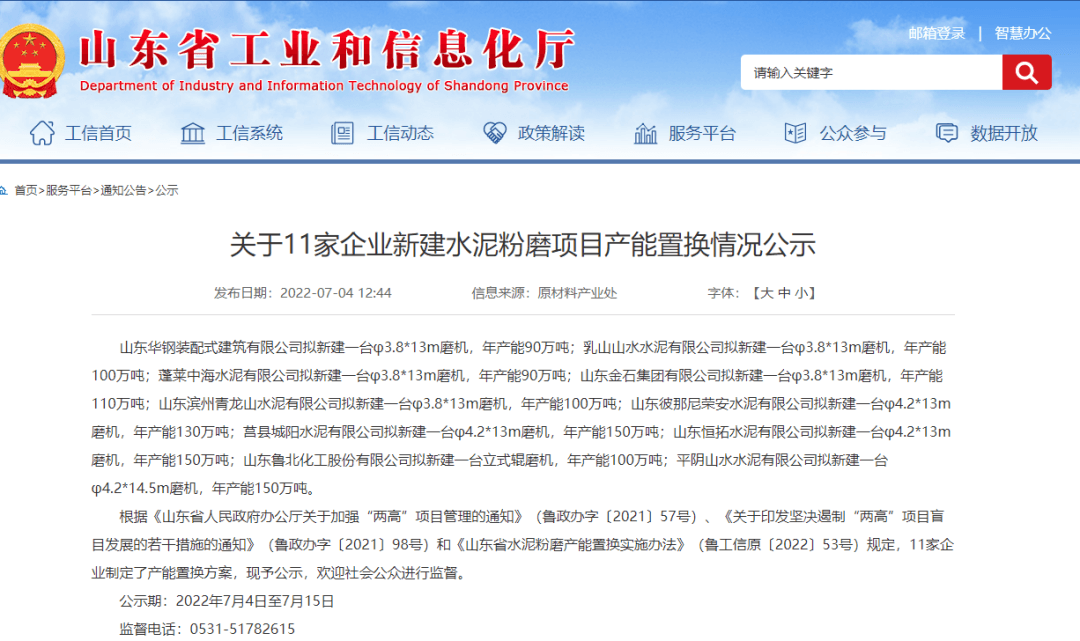 7月4日,山東省工信廳發(fā)布《 關(guān)于11家企業(yè)新建水泥粉磨項(xiàng)目產(chǎn)能置換情況公示 》提到:根據(jù)《山東省人民政府辦公廳關(guān)于加強(qiáng)“兩高”項(xiàng)目管理的通知》(魯政辦字〔2021〕57號(hào))、《關(guān)于印發(fā)堅(jiān)決遏制“兩高”項(xiàng)目盲目發(fā)展的若干措施的通知》(魯政辦字〔2021〕98號(hào))和《山東省水泥粉磨產(chǎn)能置換實(shí)施辦法》(魯工信原〔2022〕53號(hào))規(guī)定,11家企業(yè)制定了產(chǎn)能置換方案。