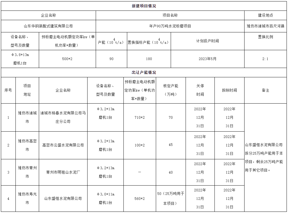 1、山東華鋼裝配式建筑有限公司 年產(chǎn)90萬(wàn)噸水泥粉磨項(xiàng)目產(chǎn)能置換情況表
