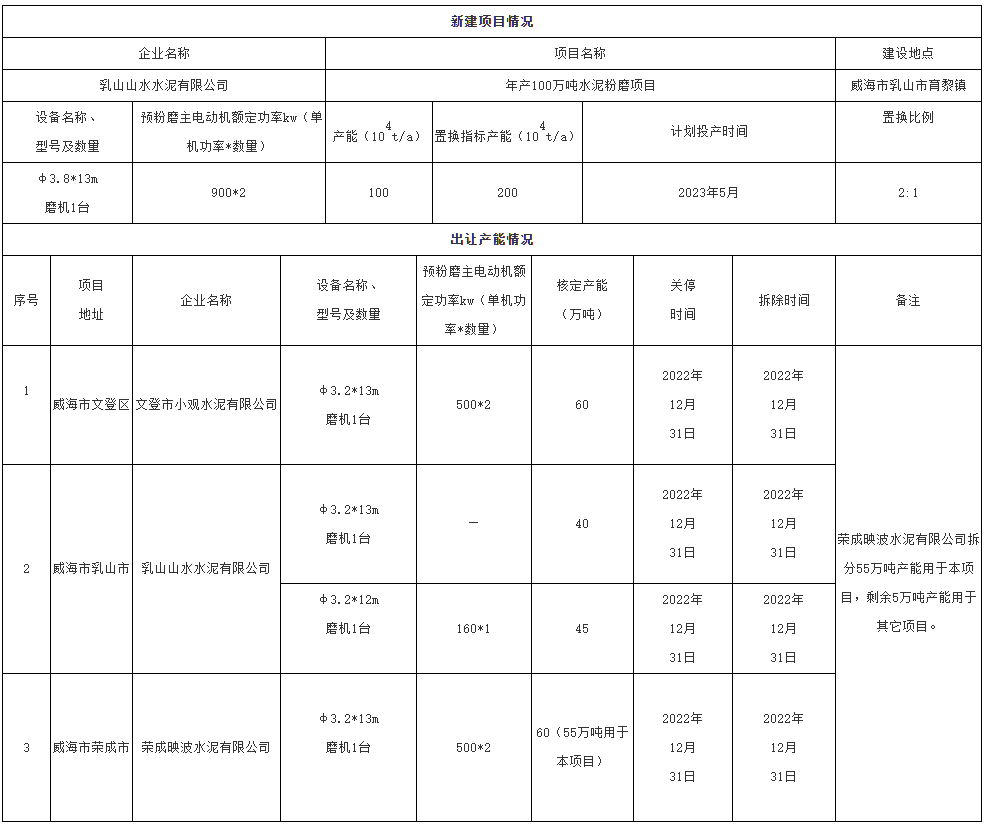 2、乳山山水水泥有限公司 年產(chǎn)100萬(wàn)噸水泥粉磨項(xiàng)目產(chǎn)能置換情況