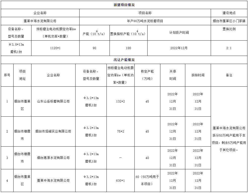 3、蓬萊中海水泥有限公司 年產(chǎn)90萬(wàn)噸水泥粉磨項(xiàng)目產(chǎn)能置換情況