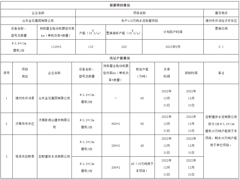 4、山東金石集團(tuán)有限公司 年產(chǎn)110萬(wàn)噸水泥粉磨項(xiàng)目產(chǎn)能置換情況