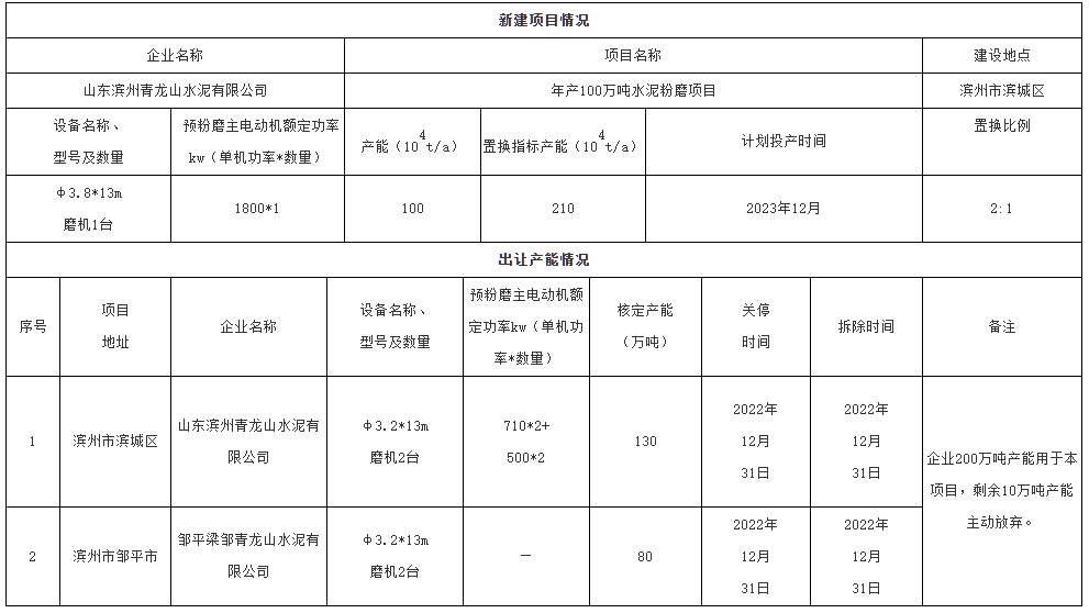 5、山東濱州青龍山水泥有限公司 年產(chǎn)100萬(wàn)噸水泥粉磨項(xiàng)目產(chǎn)能置換情況