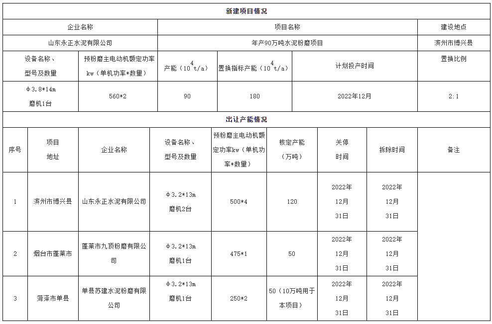 6、山東永正水泥有限公司 年產(chǎn)90萬(wàn)噸水泥粉磨項(xiàng)目產(chǎn)能置換情況
