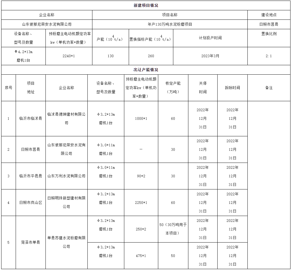 7、山東彼那尼榮安水泥有限公司 年產(chǎn)130萬(wàn)噸水泥粉磨項(xiàng)目產(chǎn)能置換情況