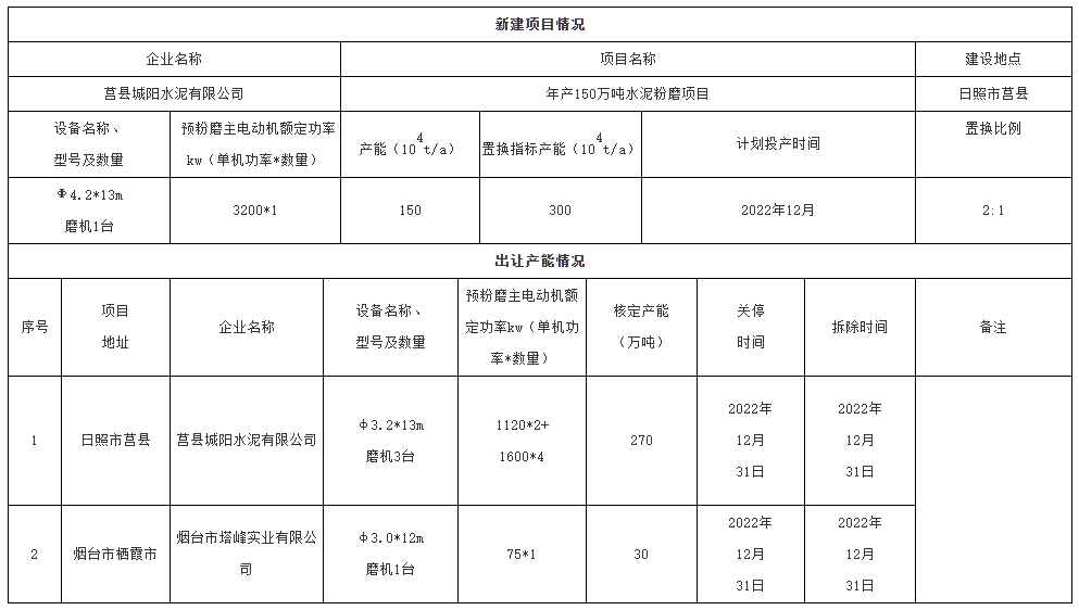 8、莒縣城陽(yáng)水泥有限公司 年產(chǎn)150萬(wàn)噸水泥粉磨項(xiàng)目產(chǎn)能置換情況