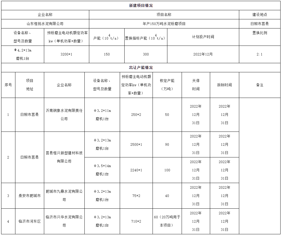 9、山東恒拓水泥有限公司 年產(chǎn)150萬(wàn)噸水泥粉磨項(xiàng)目產(chǎn)能置換情況