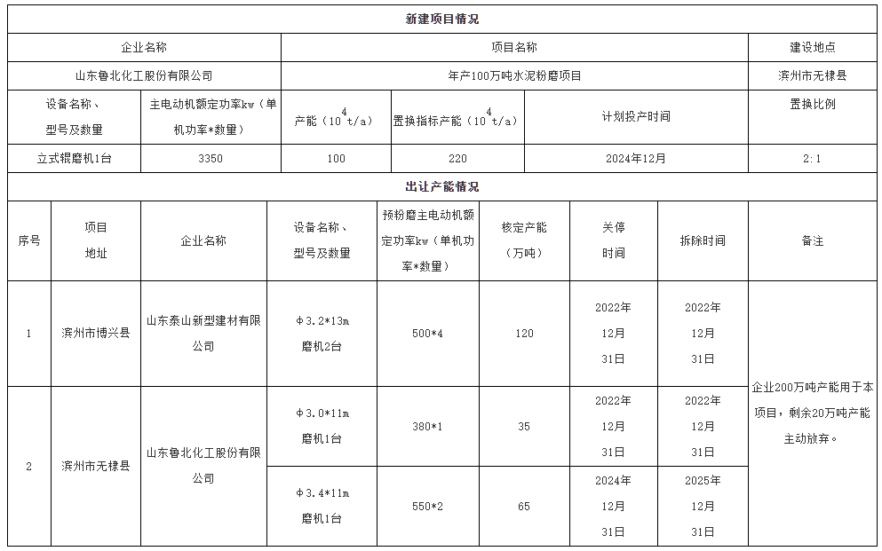 10、山東魯北化工股份有限公司 年產(chǎn)100萬(wàn)噸水泥粉磨項(xiàng)目產(chǎn)能置換情況