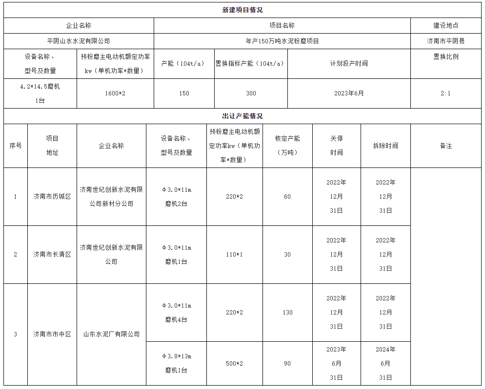 11、平陰山水水泥有限公司 年產(chǎn)150萬(wàn)噸水泥粉磨項(xiàng)目產(chǎn)能置換情況